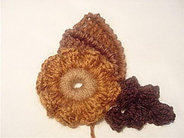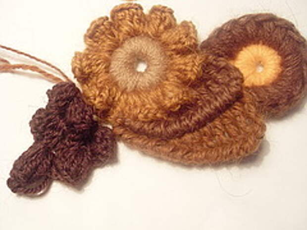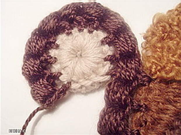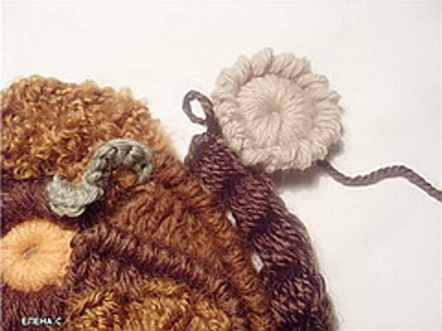 3. Следующий элемент – «пуговка», «ягодка»: Связали цепочку из 4-5-6 ВП, замкнули в кольцо, обвязали кольцо СБН. Чтобы было более выпукло - поверху обвязываем уже обвязанное кольцо еще раз. Далее привязываем нить другого цвета и по полученному колечку в каждую петлю основания выполняем пышные столбики на 4-5 накидов. Вот и готовый элемент. Часто делаю незавершенные круговые мотивы. На мой взгляд, они лучше вписываются в уже готовый скрамбль.