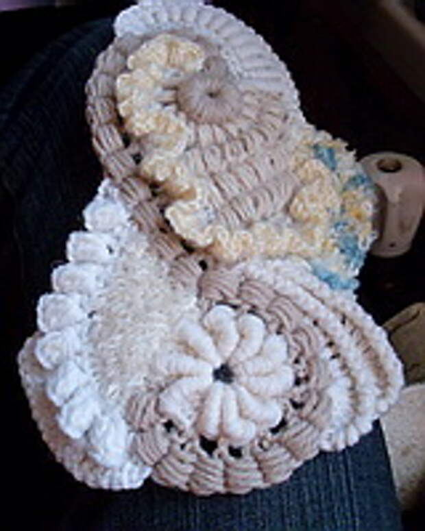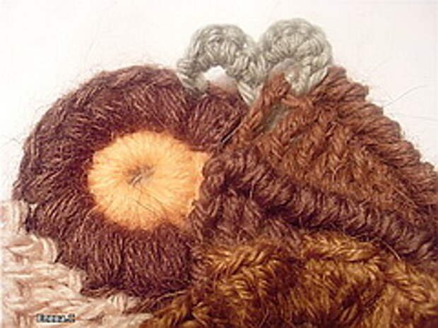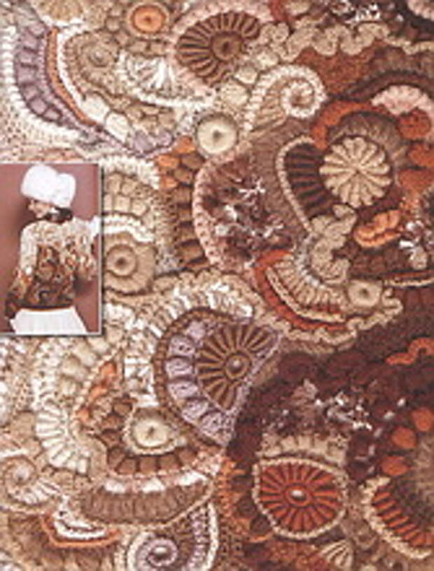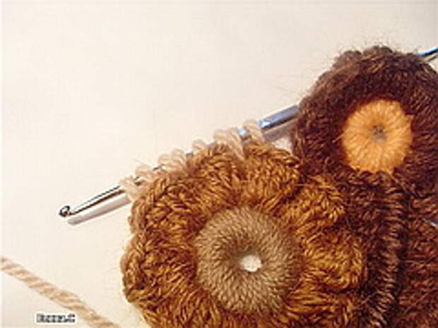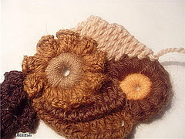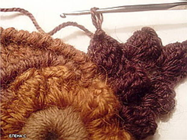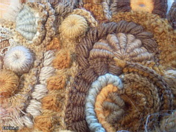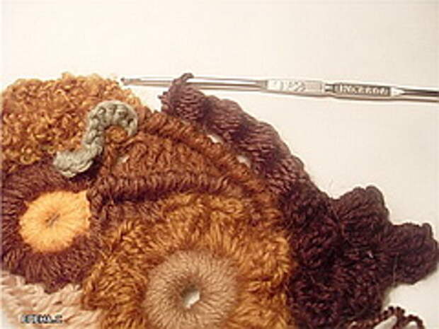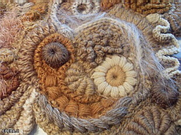 Начиная вязать, запаситесь 12-15-ю различных по фактуре пряж. Это минимальное количество, при одноцветных полотнах это количество можно уменьшить до 10, сделав упор на фактуру пряжи. (Ориентировочные данные для начинающих). Старайтесь не вязать очень толстой пряжей (100-150м/100г). Из тонкой пряжи мотивы получаются мелкие, но зато их больше и в общем полотне это выглядит лучше. Маленький секрет для убыстрения работы – вяжите мотивы и обвязки тонкой пряжей (около 400-600м\100г) , а соединение скрамблей и мотивов можно сделать более толстой ниткой (250м\100г) выполняя различные рельефные столбики. На фото ниже показан пример скрамблия, выполненного разными пряжами толщиной не более 350м/100г