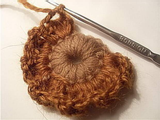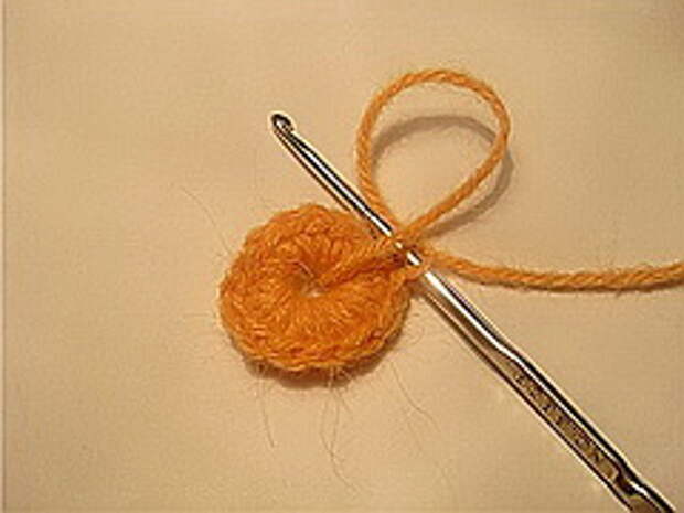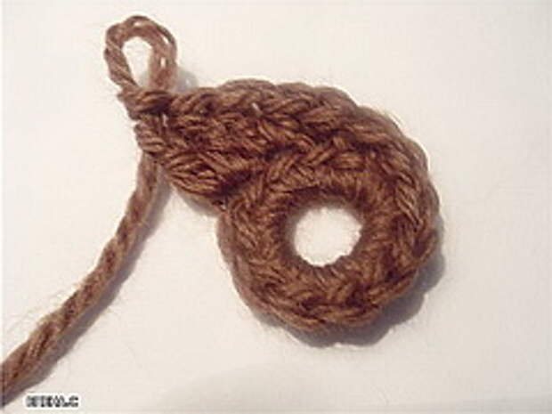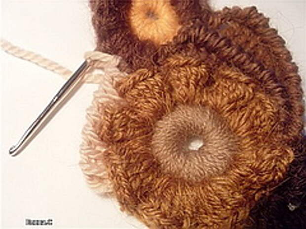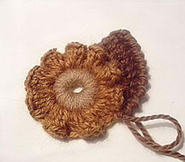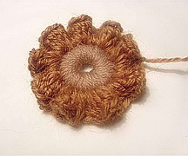 6. Далее предлагаю пример использования цепочки из пышных столбиков в качестве соединительного элемента скрамблия и зранее связанного круглого элемента. Он может быть любой по вашему желанию, но он обязательно должен быть обвязан рядом РШ.
