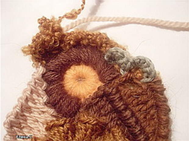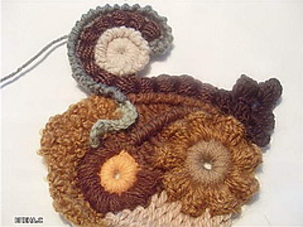 5. Все мотивы у нас достаточно выпуклые, рельефные. Чтобы подчеркнуть рельефность элементов надо связать что-то плоское. Я предлагаю элемент тунисского вязания. Так как я буду набирать от 6 до 10 петель, то длинный крючок не требуется, можно обойтись обычным. Провязав 5-6 рядов в последнем ряду я набираю петли не до конца и он получился укороченным. Это я делаю для того, чтобы избежать правильной формы. Привязываем нить другого цвета и вяжем 2 арочки из трех воздушных петель (ВП) берем какую-нибудь фантазийную пряжу. В данном случае "букле", привязываем к нашему вязанию и провязываем небольшой кусочек СБН, так чтобы арочки из ВП были перед работой. (прижали их пальцем и провязываем за ними). Все хвостики ввязываем в работу, потом отрезаем.