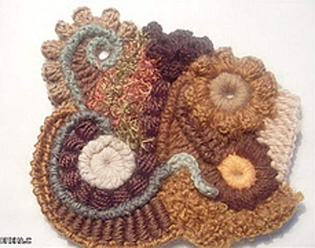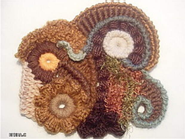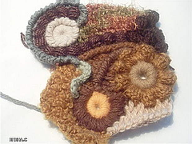 Получаются островки тунисского вязания в общей массе. Хочу также добавить - не пытайтесь усложнять работу. Самые простые столбики можно обыграть очень выигрышно. Сначала я вяжу несколько скрамблий, затем прикладываю их друг к другу - как они смотрятся вместе. Желательно, чтобы мотив или какой-то элемент одного скрамблия продолжался на другом. Тогда будут незаметны переходы.У вязания в технике фриформ есть одна особенность. Мелкие изделия сделать труднее, чем крупные. Не хватает размаху что-ли. Вот сделаешь один скрамбль и не понятно, нравится он или нет. Делаешь второй, прикладываешь, и начинает что-то вырисовывается. Поэтому, если что-то не получается на первых порах, продолжайте вязать дальше и больше размером.