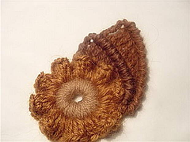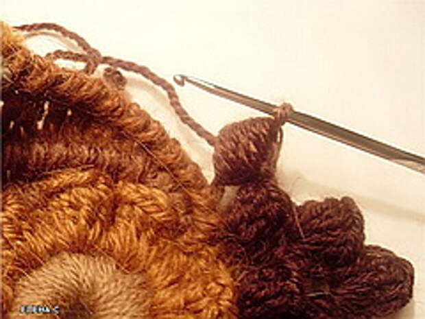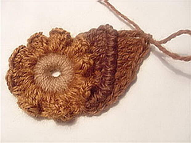 2. Далее начинаем вязать от уже связанного элемента. Привязываем нить и начинаем вязать 2-3 СБН, потом 2-3 СН, потом С2Н. Количество столбиков разного вида по собственному желанию. Затем вяжем обратным ходом рачий шаг. Ряды столбиков можно повторять несколько раз - получается как бы веерочек.