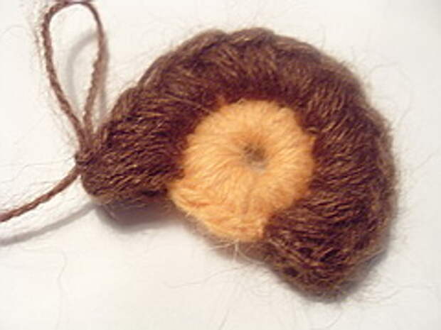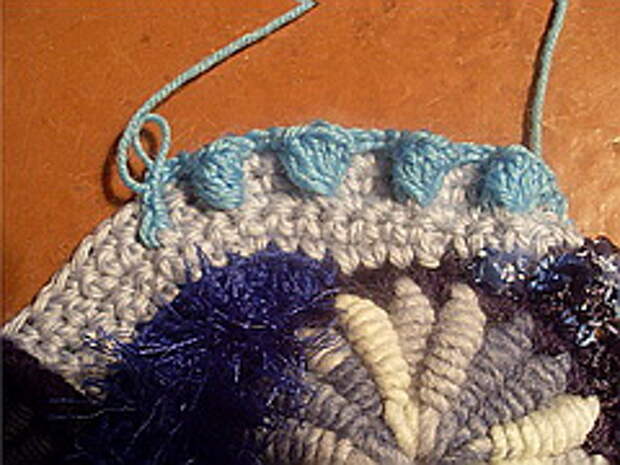 7. Обвязываем полученный элемент рачим шагом (РШ) «до логического завершения», добавляем травку или другую фасонную пряжу. Вяжем обычную ракушку, обратным ходом обвязываем ее рачьим шагом другим цветом и пришиваем (или привязываем) ее к нашему кусочку. Рачий шаг я вяжу за переднюю полупетлю. Задняя полупетля остается для дальнейшего вязания.