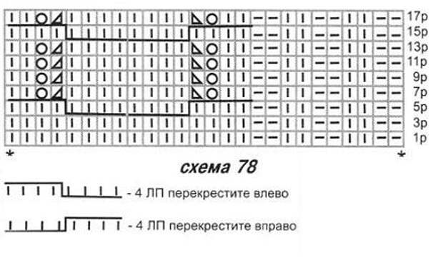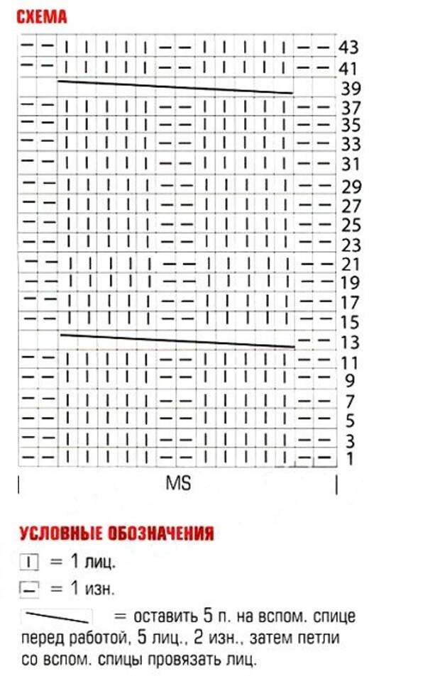 Узор с косой: вязать по схеме, на которой приведены только лиц. р., в изн. р. петли вязать по рисунку. Начинать с 1 кром., повторять петли раппорта, заканчивать 1 кром. Выполнить 1 раз с 1-го по 38-й р., затем повторять с 13-го по 38-й р.