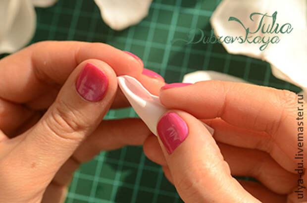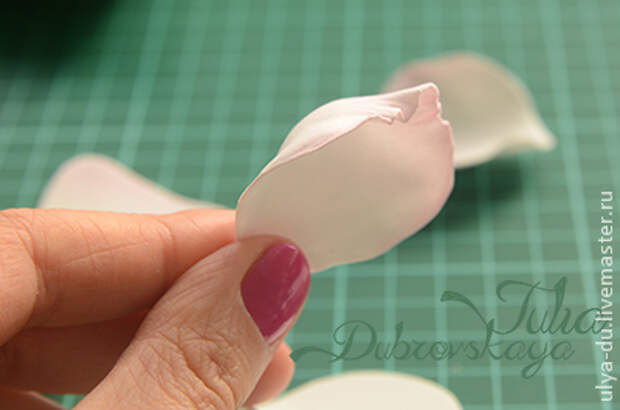 Далее, подкручиваем краешек наружу, также тщательно перетирая его между пальцами. Это нужно, чтобы край был тонким и реалистичным
