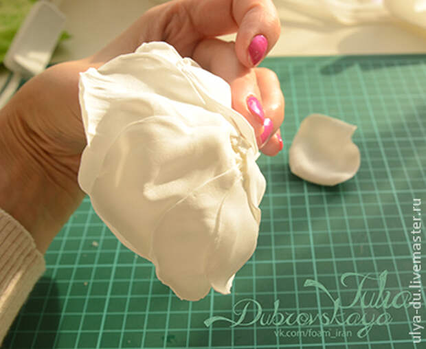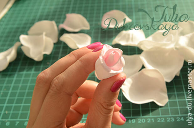Каждый раз, прикладывая лепесток, обязательно смотрим, красиво ли он лег.