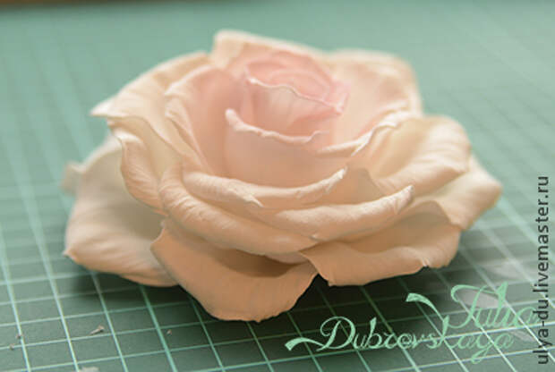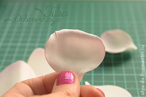 Теперь второй лепесток. Бутончик прикладываем шовчиком к его центру. Уже его мы будем клеить не в “облипочку“, чтобы роза получилась действительно распустившаяся. Прикладываем, даем объем, выравниваем.