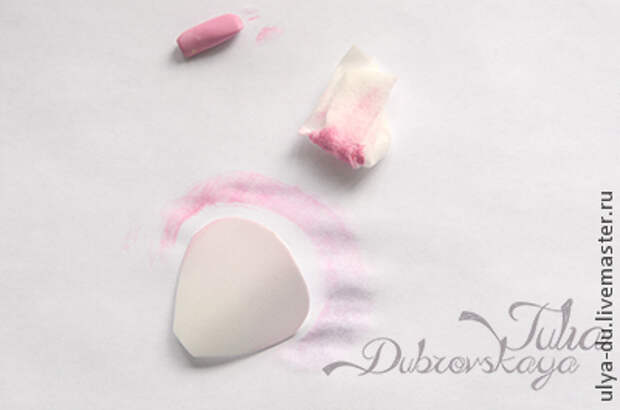 Затем берем влажную салфетку или кусочек губочки для посуды и кусочек сухой пастели. Трем салфеткой об пастель, чтобы “набрать“ краски. После этого окрашиваем лепесток, протирая его, стараясь, чтобы пегмент прошел в поры, а не остался на поверхности.