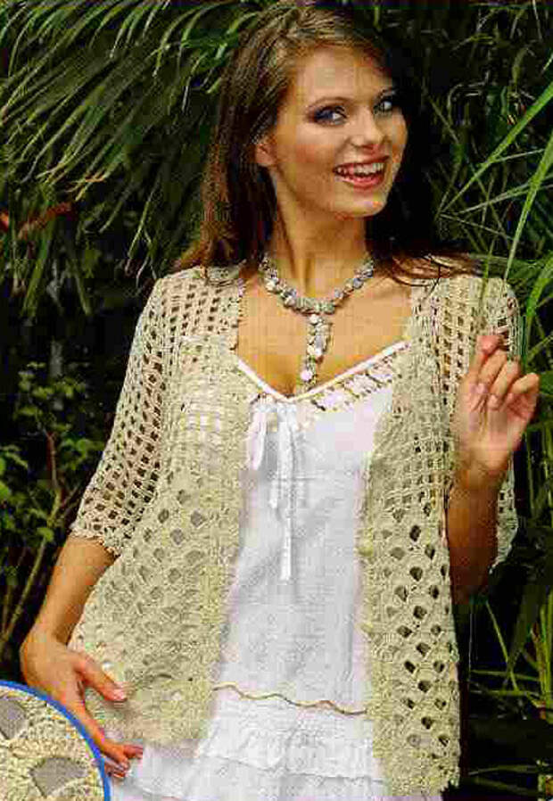 Нежный ажурный кардиган с рукавом в 3/4 будет незаменимой деталью гардероба в прохладный летний день.