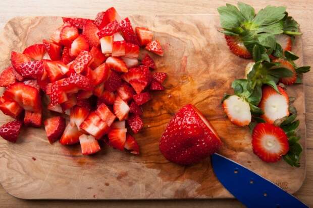 Сложите спелую клубнику в дуршлаг, как следует промойте ее, а после подождите немного, пока стечет лишняя влага. Очистите ягоды от зеленых хвостиков, обрезав или вырвав их, а затем нарежьте клубнику кубиками или ломтиками.