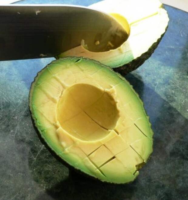Промойте авокадо, сделайте вдоль фрукта надрез и, взявшись за разные половинки и осторожно проворачивая их, разведите в разные стороны. Удалите косточку из сердцевины. Не вынимая мякоть из кожуры нарежьте ее кубиками, а затем просто достаньте с помощью столовой или чайной ложки.