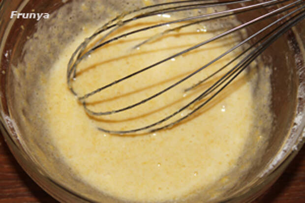 В отдельной миске смешать муку с оставшимся сахаром. Добавить желтки и хорошо перемешать венчиком.