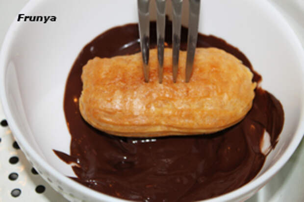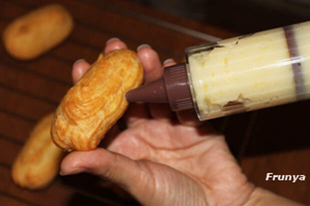 Готовые эклеры остудить и с помощью шприца наполнить их кремом.