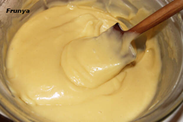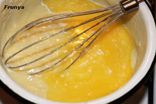 Интенсивно помешивая вливать горячее молоко. Должна получиться однородная масса. Перелить яично-молочную смесь в кастрюлю, поставить на слабый огонь и варить до загустения, постоянно помешивая венчиком. Добавить 40 г растопленного сливочного масла и перемешать.